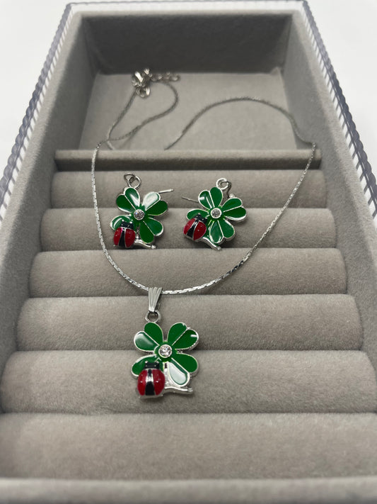 Emerald Clover Leaf Necklace Set, Lucky Pendant, Good Luck Jewellery