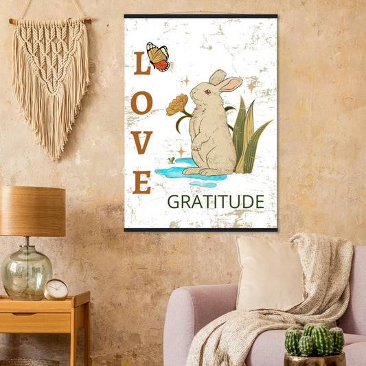 Love and Gratitude Poster with Hanger, Home Decoration, Boho Vintage Rabbit